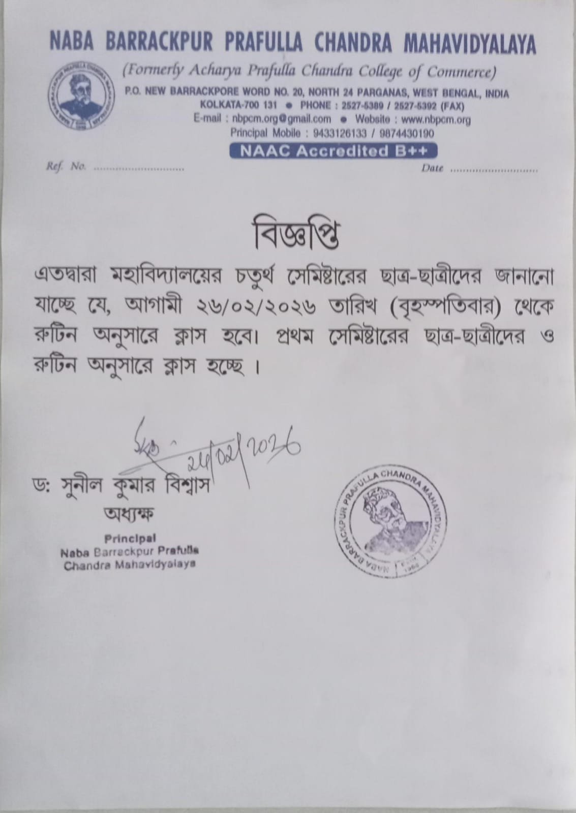 | I welcome you to Naba Barrackpur Prafulla Chandra Mahavidyalaya with pride. It is an honour and privilage to be the principal of Naba Barrackpur Prafulla Chandra Mahavidyalaya, The college stands for excellence and continuously sets the highest standard. We feel proud to provide quality education by equipping our students... |